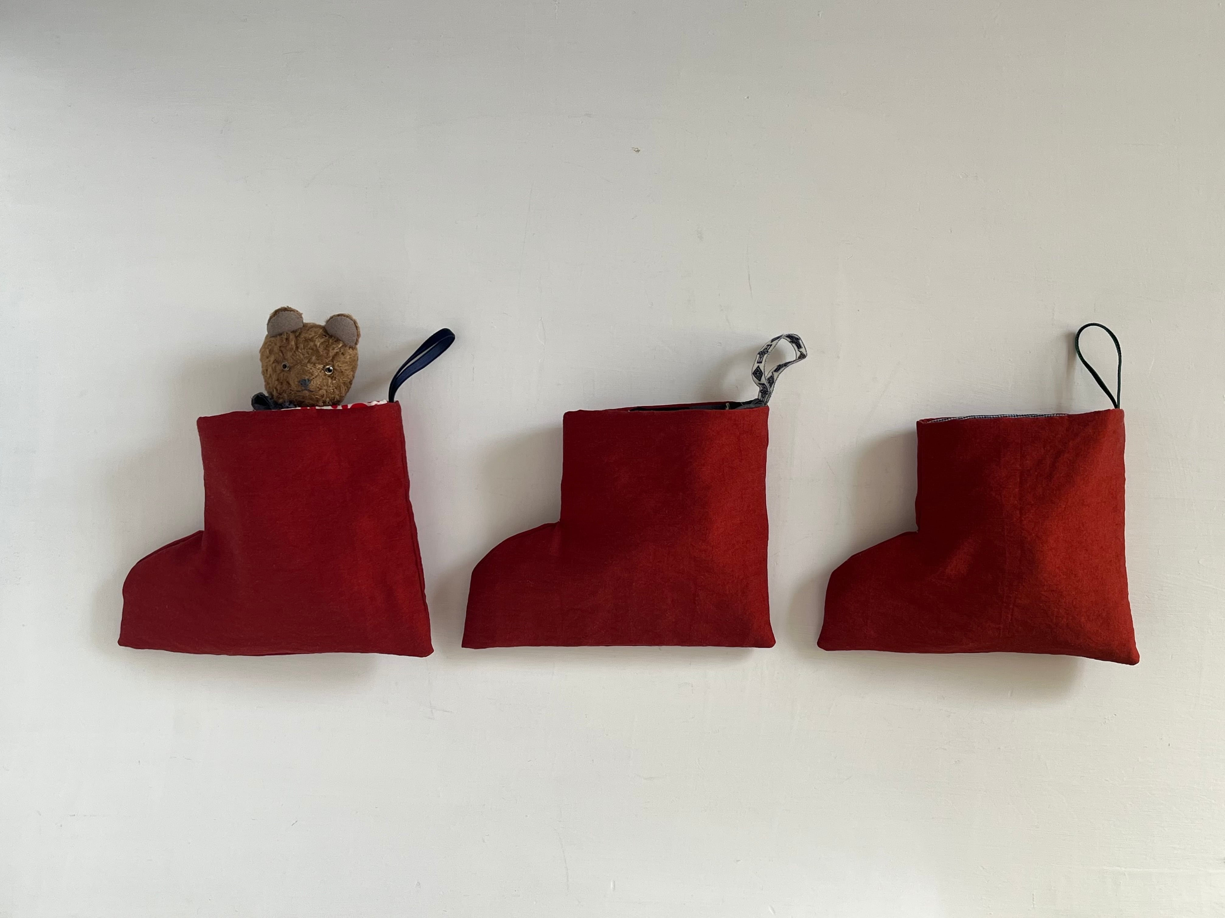 「mmmyokのクリスマス2025」限定のクリスマスブーツです。中にテディベアを入れて飾ることができます。クマの顔が少し出るような作りで、クリスマス気分を盛り上げてくれるはず。