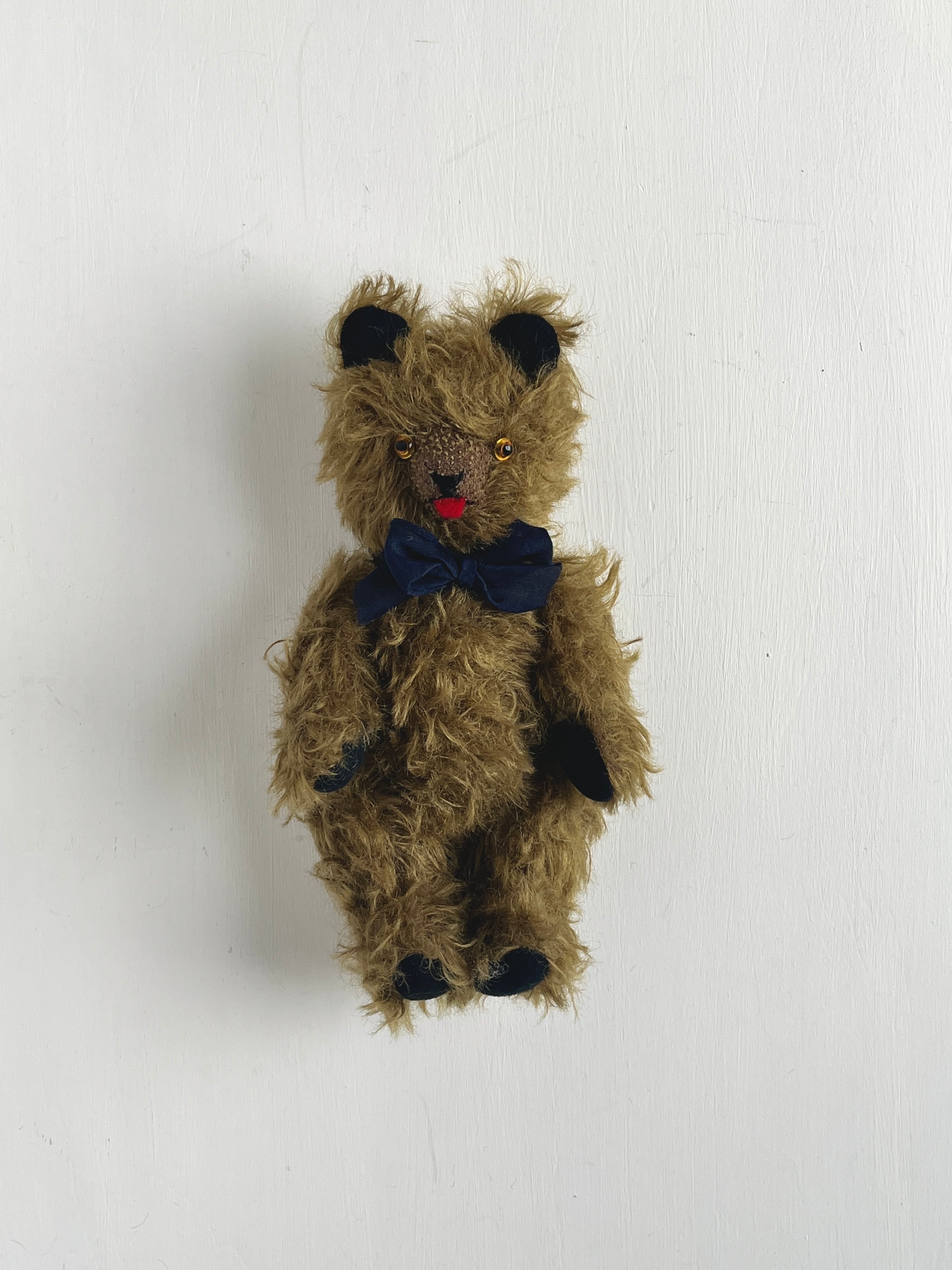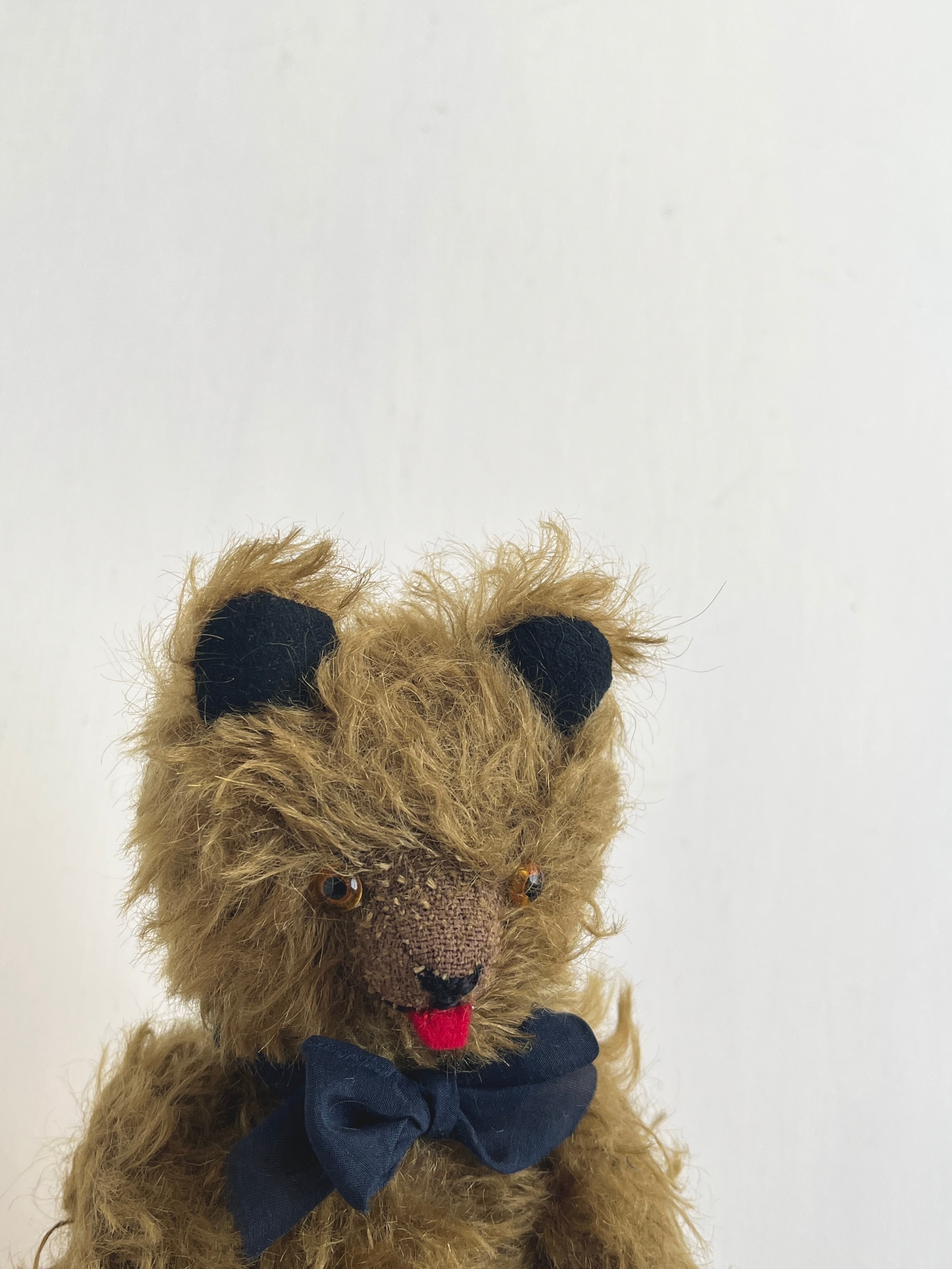 オリーブブラウンと黒いパットの落ち着いた雰囲気に、舌出しのチャーミングさを足した個性的なベア。