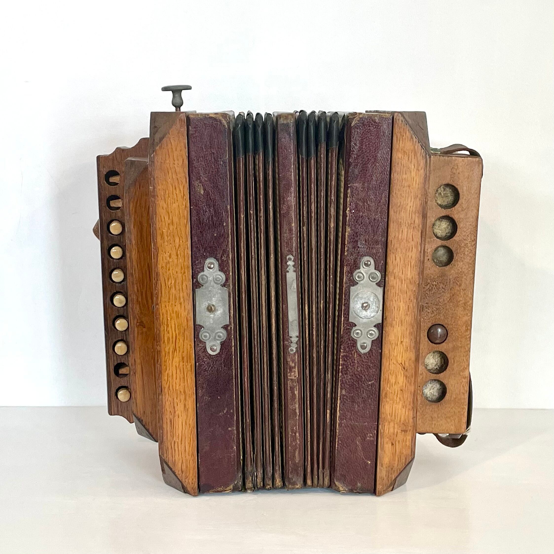 木部、紙製の蛇腹、ボタンにはダメージがあり、音は出ますが、演奏は難しい状態です。